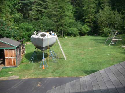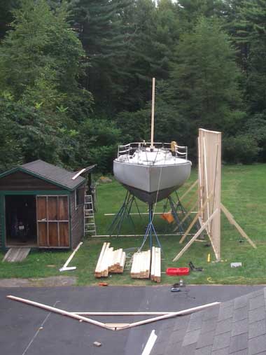 Now that GREYHAWK is resting comfortably in my yard, I need to erect a tent over her for the winter to protect her from the elements during phase 2 of the project -- mainly refurbishing the deck. Here's a view of her from a second story window of our house: