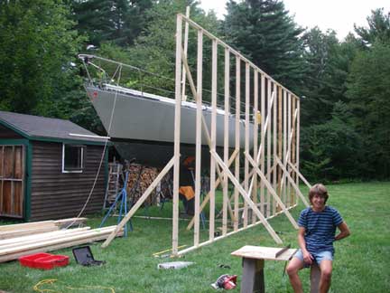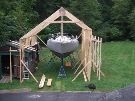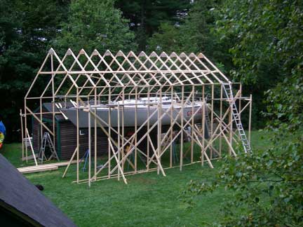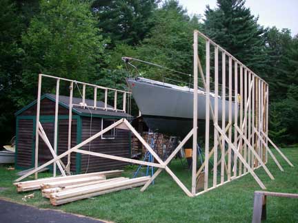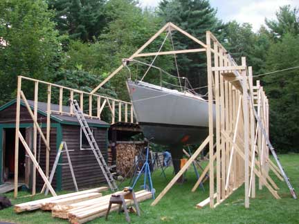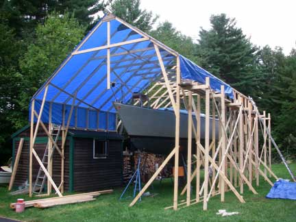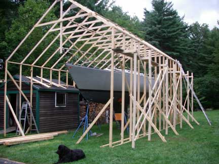 The proto-type roof truss is leaning up against the front of the two walls. Once the walls are done, we'll make up the remainder of these (15 in all) and then the plan is to lift them in place using gin poles from the deck of the boat. To finish the roof, we'll set up scaffolding brackets on the outside of the 14' tall right wall from which to work; we can work from the shed roofs on the left wall.