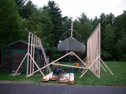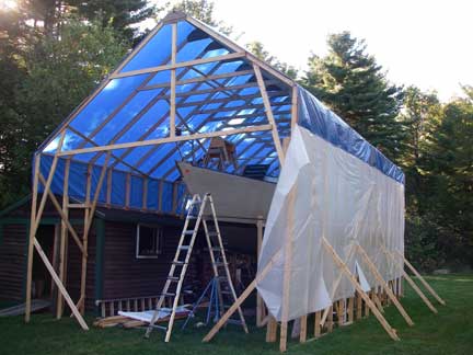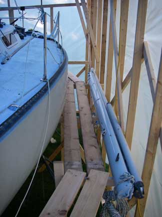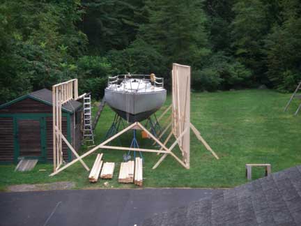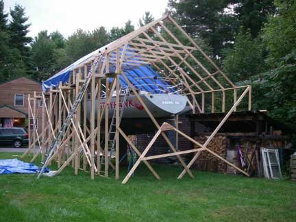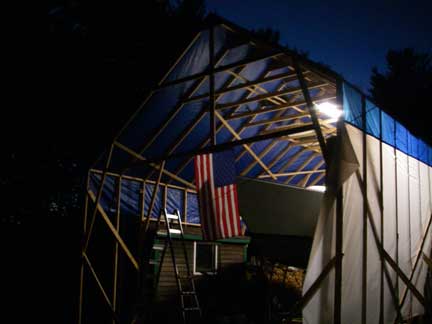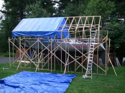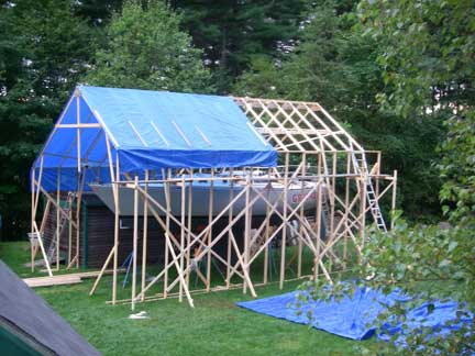 I came home from work around lunch time Friday to work on the "tent." I installed some additional bracing, and erected supports for a scaffolding along outside of the tall right wall, 3' down from the top. With that in place, I used the proto-type roof truss as a template to construct another truss, and then I raised the prototype up onto the boat to set it in place (after setting up ladders, etc...). While I was holding the truss in place, standing on the boat, my wife tied off the guy ropes to the boat's bow and stern cleats. Then I went and screwed the truss down to the left and right walls.