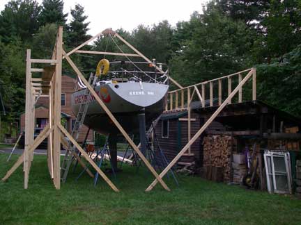 Also constructed some staging -- a wrap-around "dock" -- about seven feet off the ground all along the port side of the boat. This puts the toerail at belt-buckle height. I now need to construct a stairway for ease of access up to this "dock." For work on the starboard side of the boat, I will have to use ladders and some very tall horses to support the staging...