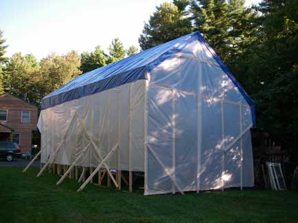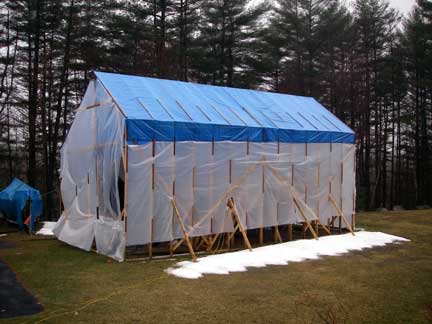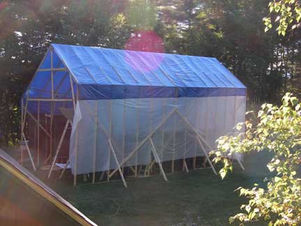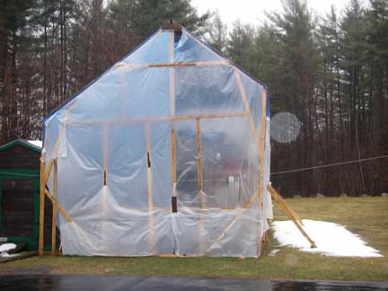 Installed some framing on the gable ends, particularly at the rear, and stapled up 6 mil plastic to enclose the rear and right side. I'll get to front sometime later (most of the weather comes at from the rear of the "tent" so that was the most important to get covered).