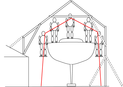 All lumber is shown as 2x4's (except the scaffolding planks); the studs are 14', rafters 10', bracing and collarties 8'. I envision 13 of these trusses, one every 3', tied together at the ridge, eaves, and base, and with lots of diagonal bracing, for a 36' long tent. Cables and stakes, too.