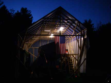 Finally, I've placed a couple of 4' flourescent shop lights (with electronic ballasts for cold weather starting) over the collar ties to illuminate the decks for working on the boat in late afternoons and evenings....