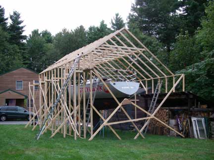 But I decided the posts on the left would be in the way of our access to firewood stored in the sheds to the left of the boat in the picture above, so I decided to extend the rafters over to the sheds, while still keeping the roof peak over the centerline of the boat. I also decided that I don't need full headroom over the cabin top, which will allow longer collar ties: