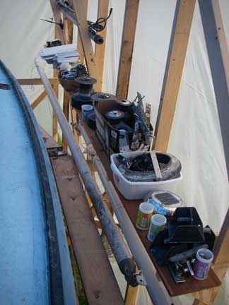 I installed a shelf along the right wall of the boat tent, just above the staging, as a place to store all the hardware taken from the deck. In addition, a lot of stuff like tracks, handrails, teak trim strips, etc... has been stored overhead on top of the collar ties.