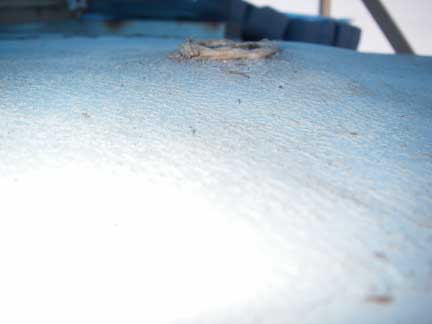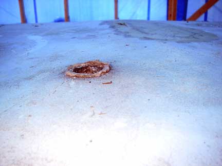 This is where the through deck gland for my hydraulic vang was located, in the cabin roof between the mast and the sea-hood over the companionway hatch. Water got in, saturating the core in the area around the gland. Upon freezing, it has formed a significant dome, and cracked the top fiberglass skin. (The extent of the doming is difficult to photograph, but it is really pretty significant!)