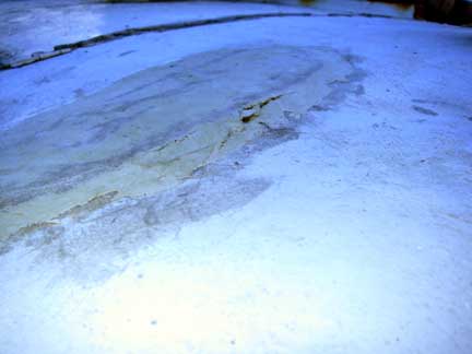 Clearly, this area had been re-cored once before (consistent with the previous owner's report that he had the deck "professionally" recored once already), but they had not done an adequate job of adhereing the new balsa core to the bottom skin... Interestingly, the "scrim" from the balsa was adhered to the bottom skin. Other evidence that this area had been re-cored once before is that the top skin was made of chopped strand mat instead of woven roving as elsewhere, and that there was no molded in non-skid pattern as elsewhere.