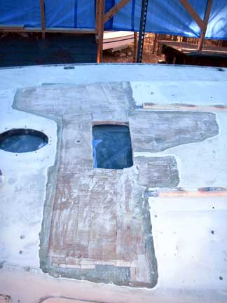 This is a view of the current condition of the area shown above where the deck had domed. I cut out for a new ventilation hatch, and cut away the top skin and removed rotten and/or delaminated core from the surrounding area, prepared the area, and glued in new balsa core. I've started grinding out bevels on the adjacent top skin for laying up a new skin.