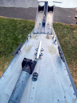 A couple of other things to note: (1) The forward supports for the bow pulpit come down just inside the skene chocks. They partially block the channels of the anchor rollers, but there is still plenty of room for the anchor shank, chain, and rode to pass. Unfortunately, there is not enough room for a pole to pass through one of the channels for use as a sprit. (2) The holes in the deck at the bottom center of the picture, aft of the cleat, are for a padeye that will support an inner forestay, and marks the forward end of a center track.