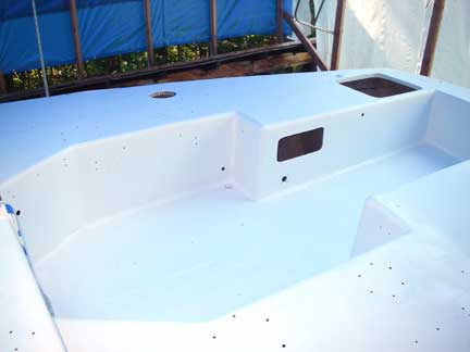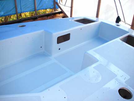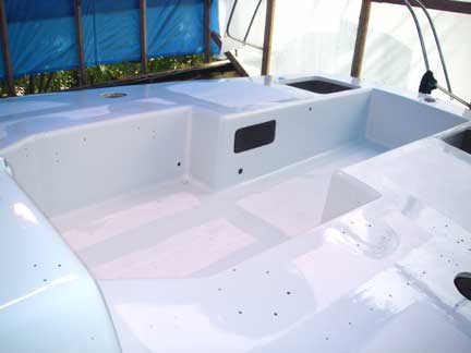 Last Month, a major transformation occurred as the deck was primed. Over the course of this month, we've finally finished painting the deck! Yeah!!!! This included a second coat of primer, sanding that smooth, a couple coats of "skid" paint (with sanding and cleaning in between), then taping off the "skid" areas for painting of the "non-skid" areas, more sanding and cleaning, and finally applying the non-skid (KiwiGrip).