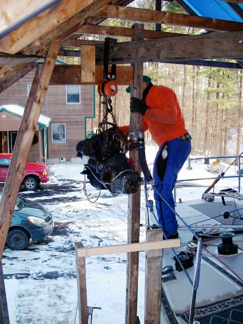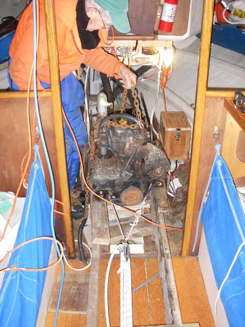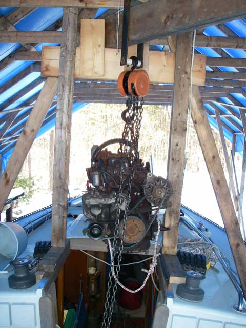 First step was to get it off it's mounts and slide it forward from under the cockpit so that it could be lifted up through the companionway. We built a set of "rails" out of 2x8s on which to slide the engine forward, used a big crowbar to lever the engine up, and a block and tackle to pull it forward on the rails.