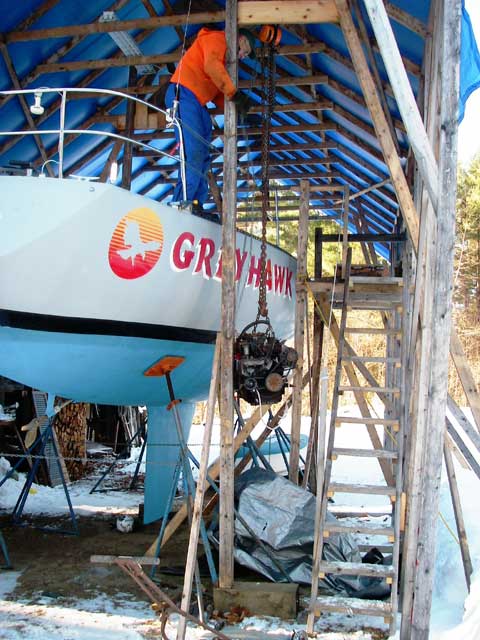 My Dad had hade made a roller assembly to support his chain hoist from a beam. So in the fall after building stairs and balcony, I had built a support framework over the companionway, and off the aft quarter of the boat, supported by post made up of 2x4's screwed together and tied into the structure of the boat tent. I made a beam out of two ten-foot 2x8's screwed together which supported the roller and spanned between the supports. This assembly made a gantry crane with which we could lift the engine up through the companionway, slide it across the cockpit with the roller on the beam, and then lower it down to the ground off the side of the boat.