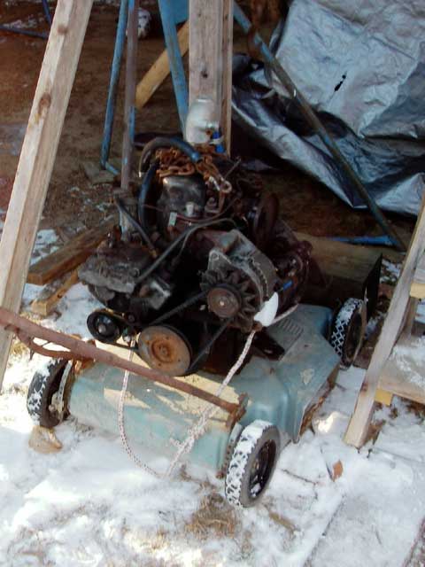 On the ground, we set the engine onto my Dad's special Engine-Moving Dolly -- an old lawnmower deck! It worked great!