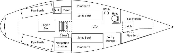 - 2 aft pipe-frame berths with 3-inch foam cushions covered in blue acrylic canvas (angle adjustable with block and tackle system)