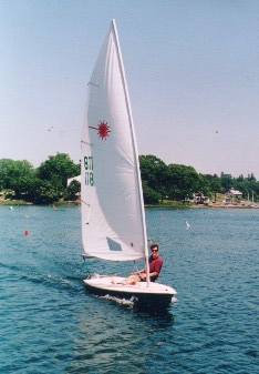 Tim sailing Laser #811 at Harborfields in West Boothbay Harbor, Maine, July 1995, after completion of the Mast Step Repair.
