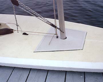 The new mast-step installed. It consists of a trapezoidal deck piece with a tube attached for the mast. It gets glassed to the reinforcing block installed on the bottom of the hull and to the flange installed on the underside of the deck. All of this work must be accomplished through an inspection port, and the piece is "clamped" simply by piling weights on it.