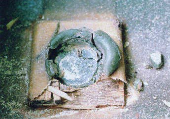 Close up of the rotted plywood and broken fiber glass of original mast step reinforcement block.
